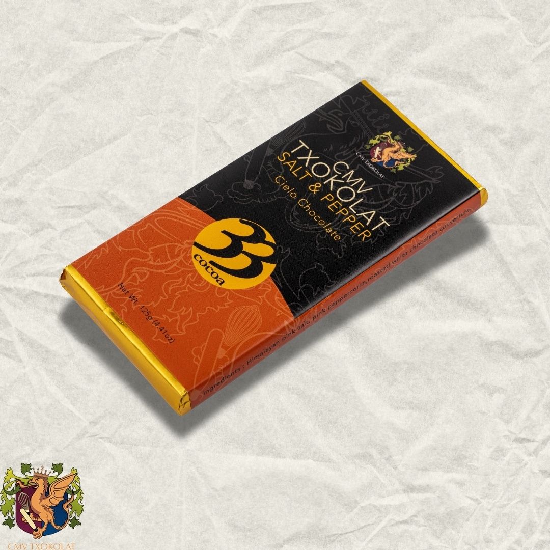Mindoreño sea salt & Brazilian pink peppercorns in a roasted white chocolate