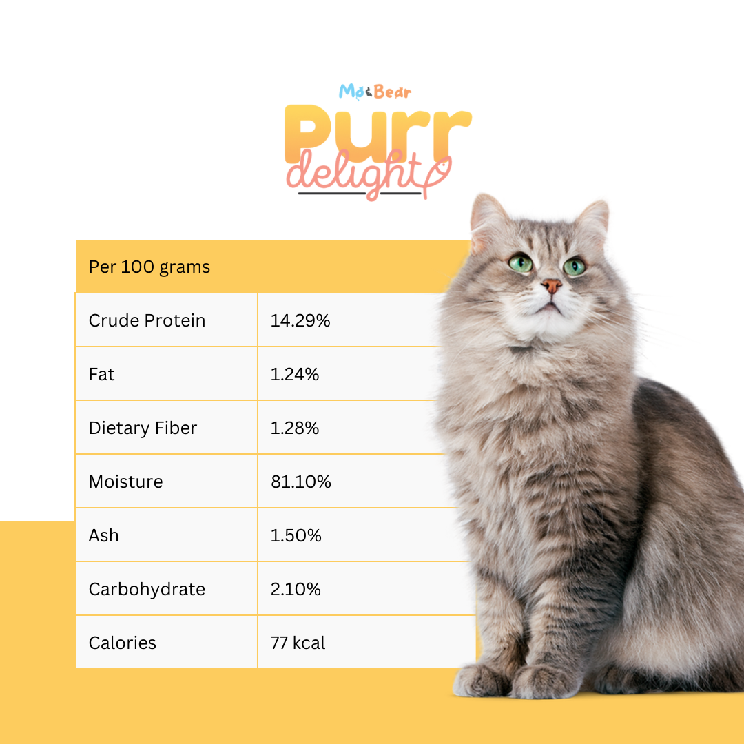 Purr Delight Tuna in Jelly cat food satisfies your cat's taste buds and supports their overall health. With the natural benefits of Omega-3, you can trust that your furry friend will stay happy and vibrant with every meal. Choose Purr Delight for a premium pet care solution that combines taste and nutrition. Made with real tuna flakes and red meat